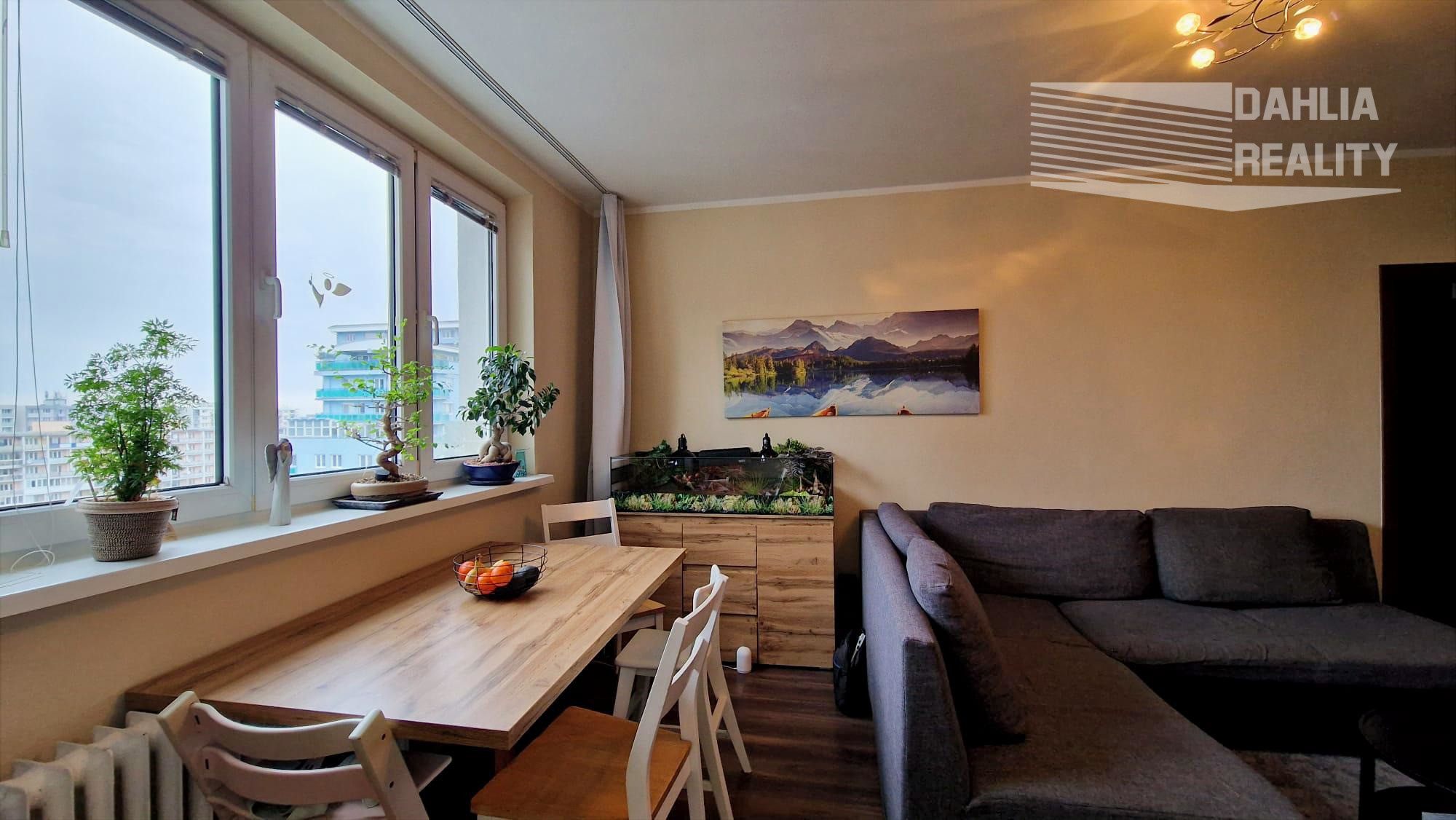 Výhodou dispozície bytu sú veľké okná v izbách aj obývacej izbe a kuchyni, čím pôsobí byt svetlý. Vzhľadom na vyššie podlažie (8.poschodie) sú veľkolepé výhľady na Bratislavu a čiastočne karpatské vrchy.