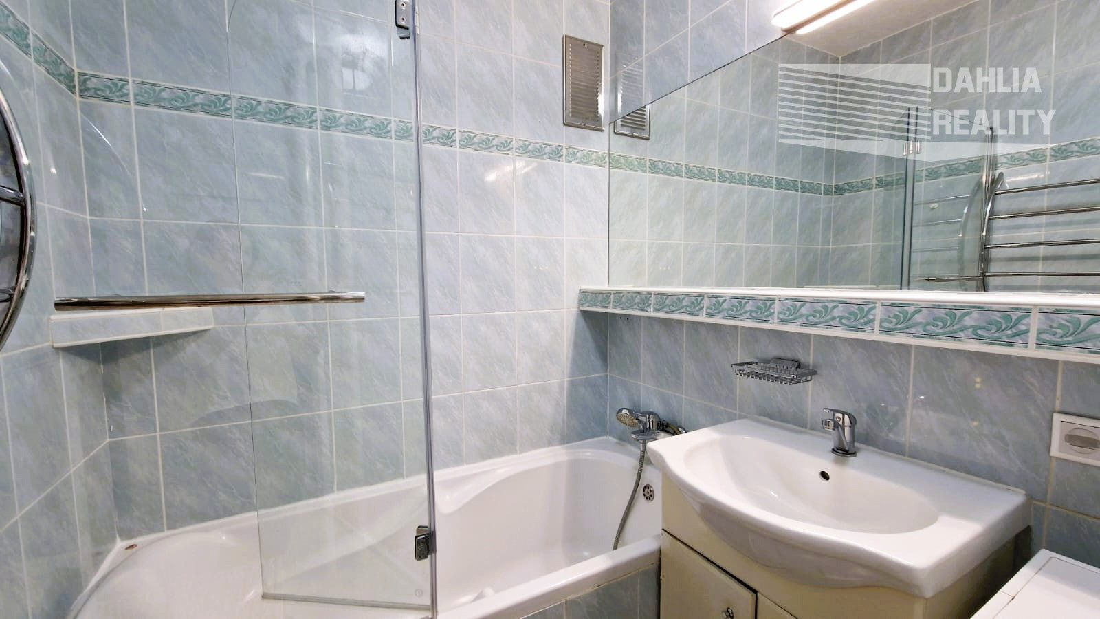 kúpeľňa = kúpeľňový nábytok so zrkadlom a skrinkami, vaňa so sklom;