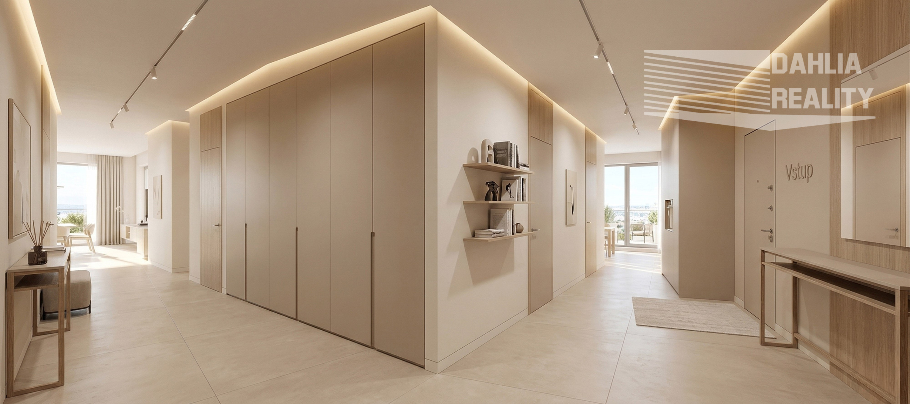 Vo vstupnej chodbe je priestor na šatník a je tu umiestnené samostatné wc. Z chodby je vstup do jednej časti bytu priamo do samostatnej kuchyňne a kúpeľne, z kuchyne je vstup do jednej z izbieb (spálne/detskej/pracovne). Z tejto časti bytu je možnosť výstupu na krásnu strešnú rozsiahlu terasu. Do druhej časti bytu je vstup z chodby priamo do obývacej izby, z ktkorej je dostupná ďalšia izba (spálňa). Byt má výbornú priestrannú dispozíciu a veľké izby. Výhodou je možnosť prepojenia kúpeľne napríklad s jednou s izieb a vytvorenia tzv. master-room. Vo fotogalérii nájdete zakreslenie dispozície aj s 3D návrhom a vizualizácie interiéru.