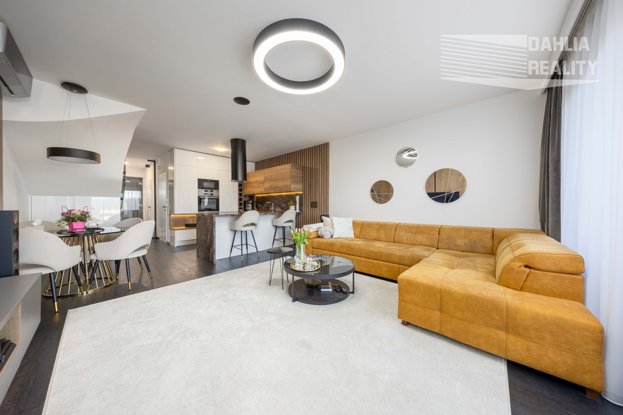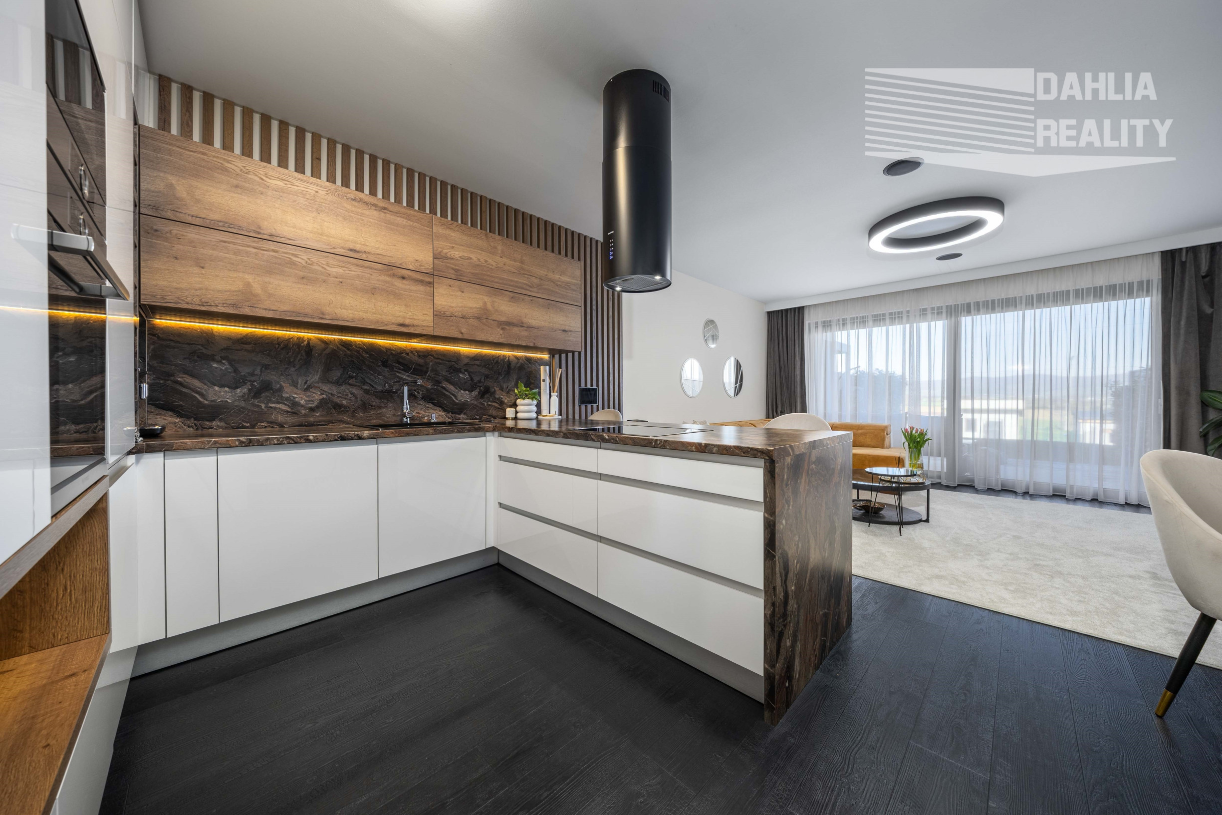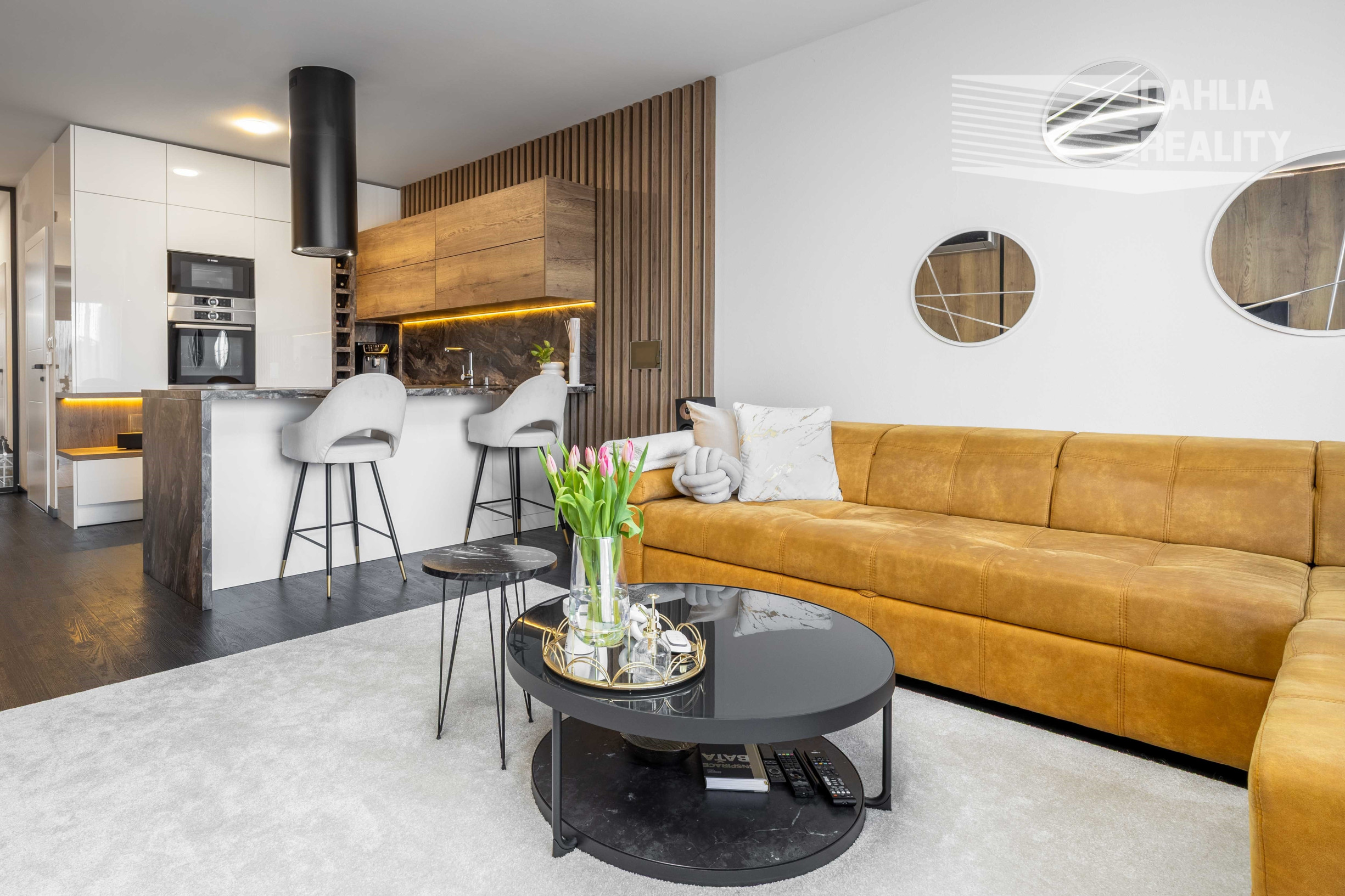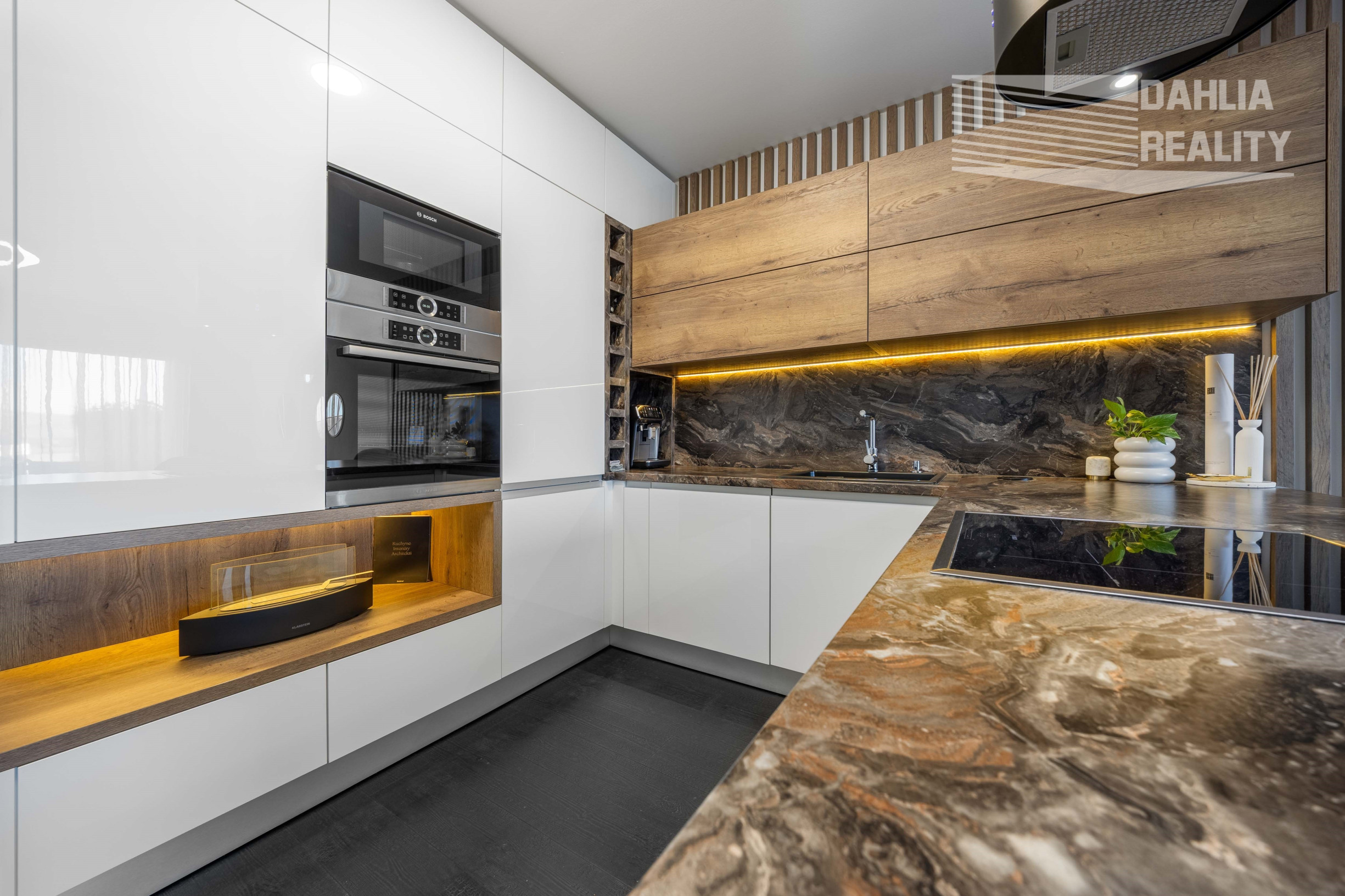 - na mieru vstavaná moderná kuchynská linka s pultom s kvalitného nadčasového materiálu v kombinácii s drevom, vybavená všetkými spotrebičmi značky BOSH: indukčná platňa, elektrická rúra, mikrovlnná rúra s grilom, umývačka, chladnička s mrazničkou, moderný digestor,