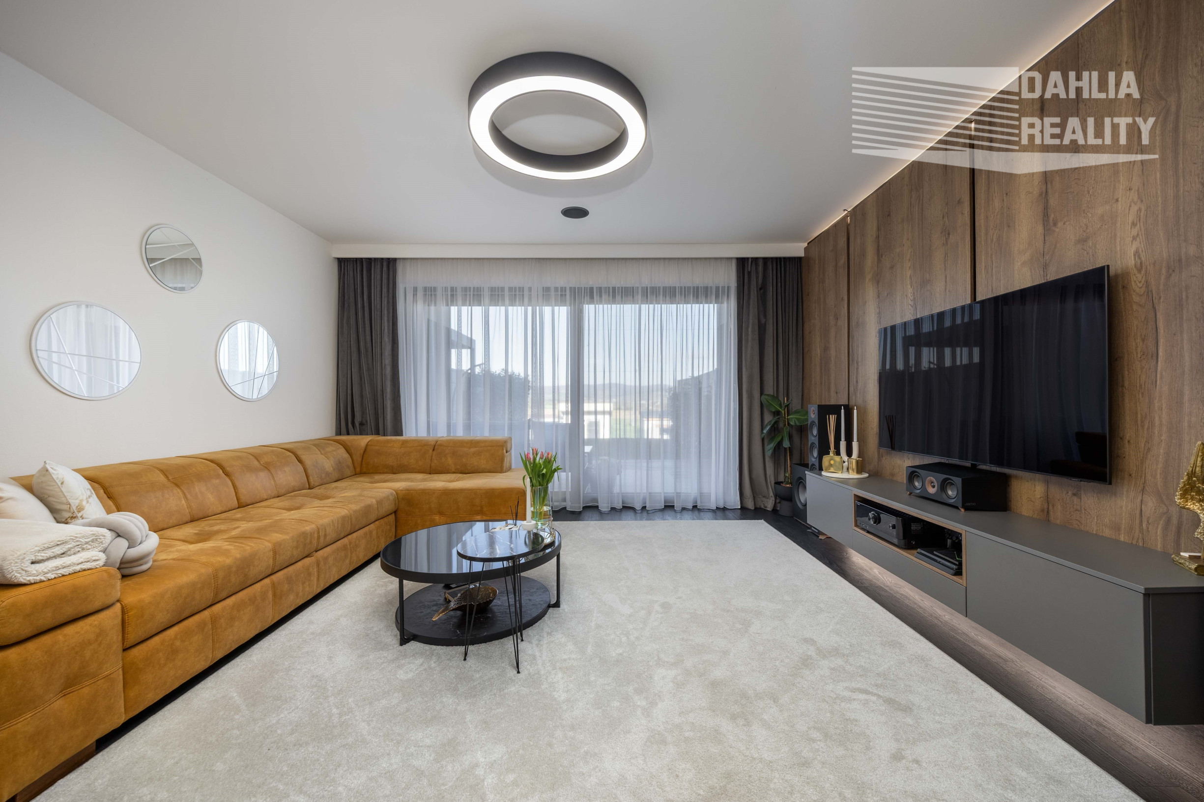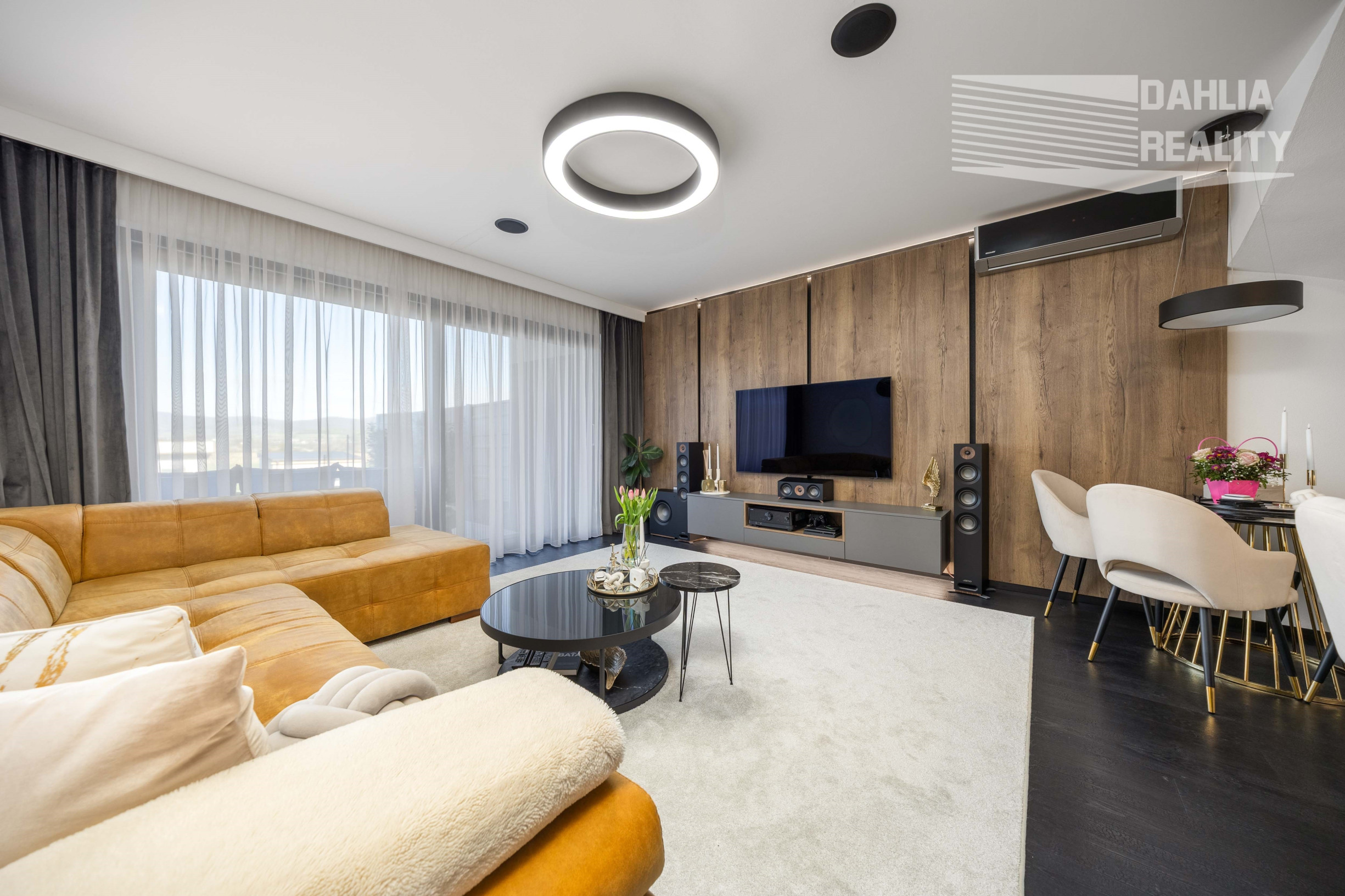 - v obývacej izba na mieru vstavaný nábytok, na stenách použité drevené obklady,