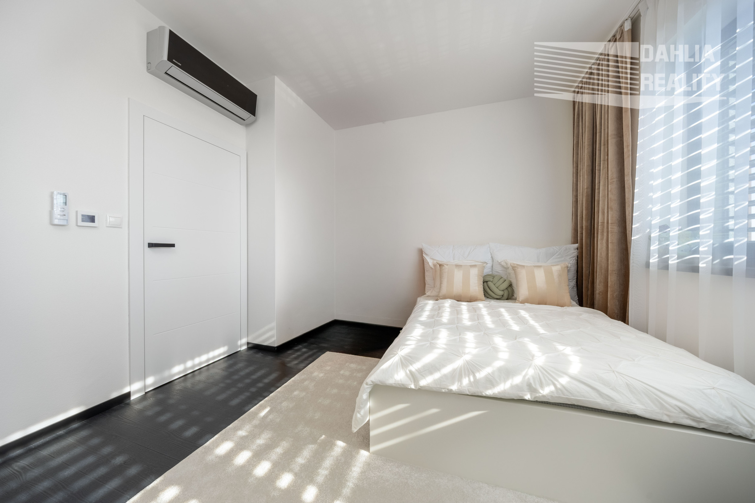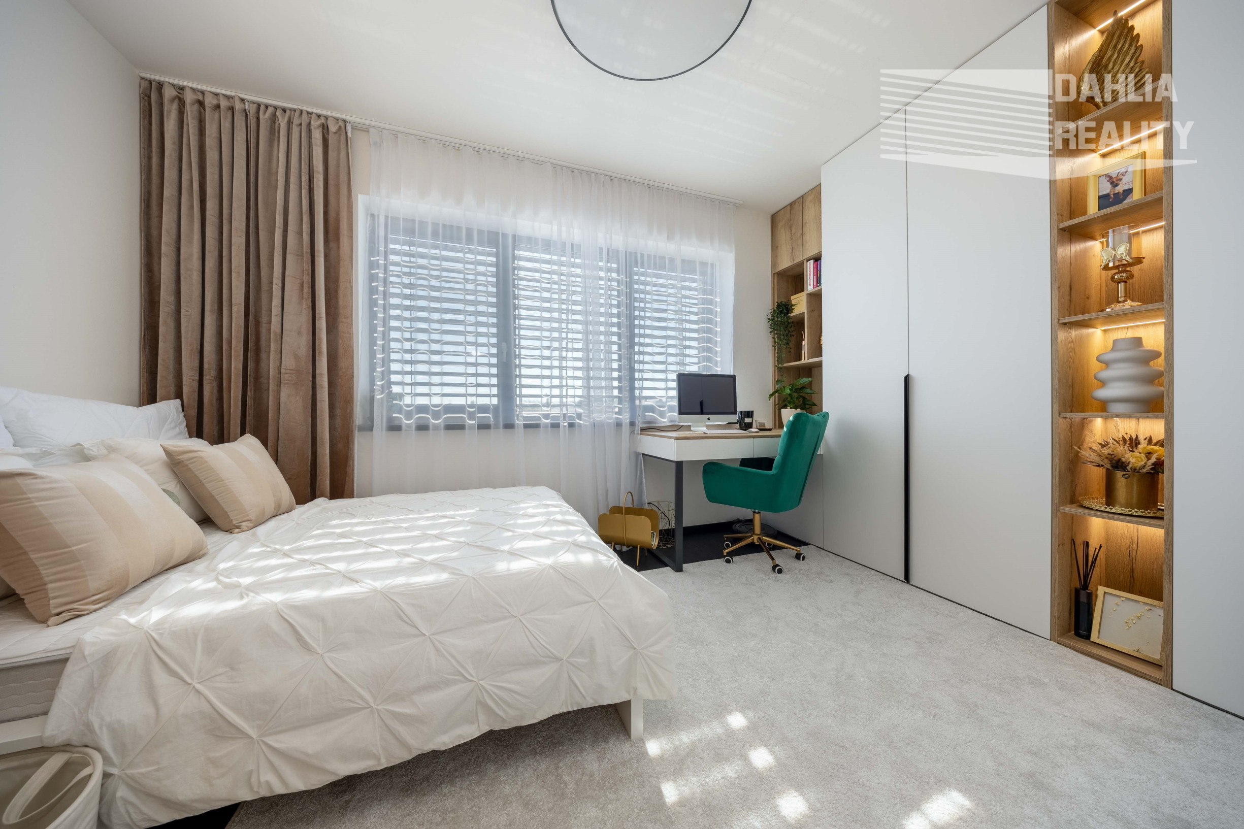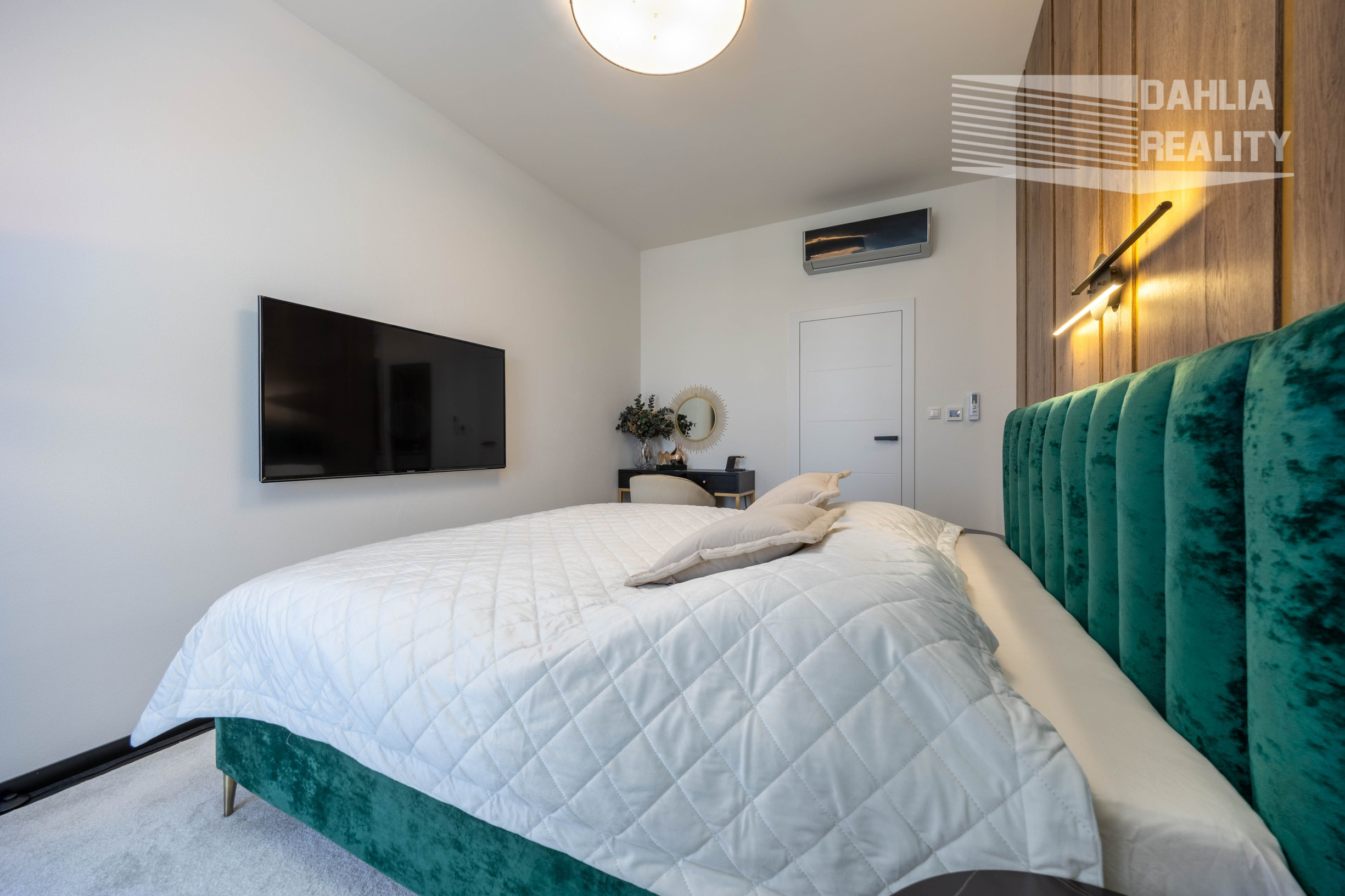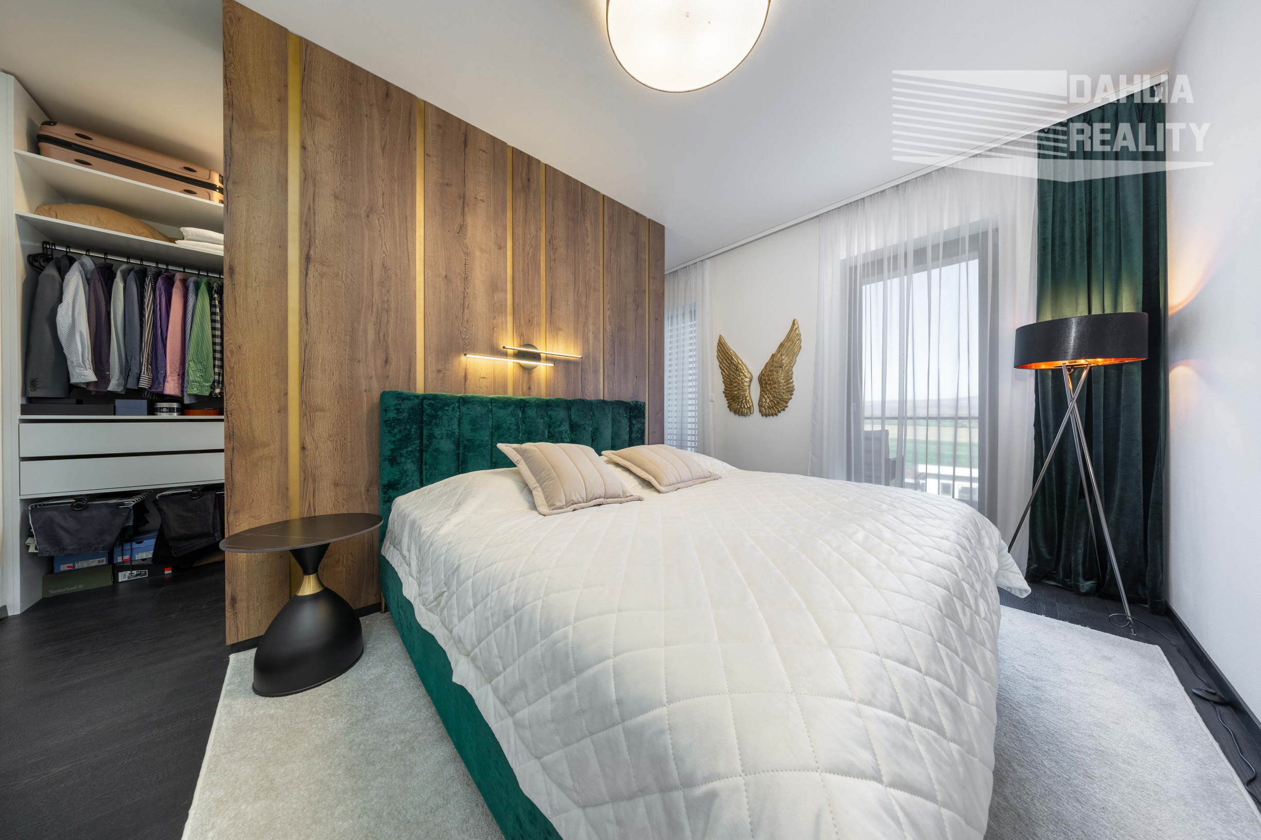 - v spálni sa nachádza veľký šatník a čalúnená moderná posteľ, pričom šatník a posteľ sú predelené priečkou s dreveným obkladom.