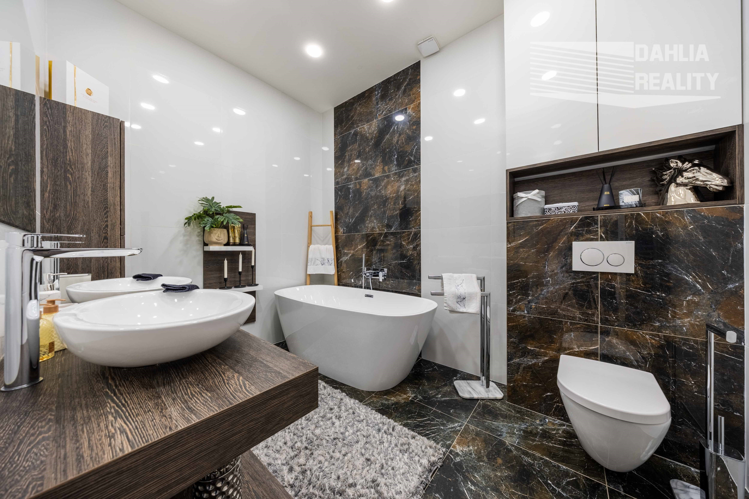 - kompletne zariadené kúpeľne s modernými dizajnom, v dolnej kúpeľni sprchový kút v hornej kúpeľni modrené drevené skrinky s dvoma umývadlami a samostatne stojaca vaňa,