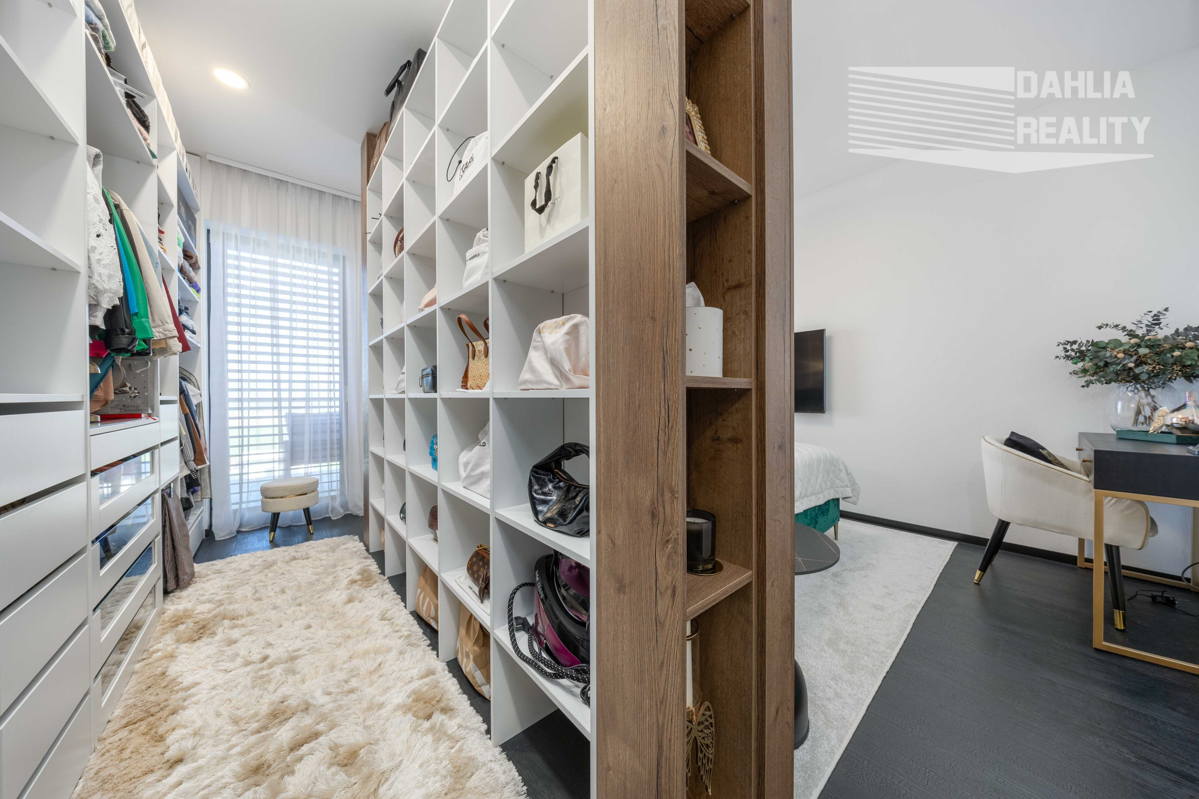 - veľká spálňa moderne architektonicky prepojená s praktickým na mieru vybudovaným šatníkom, pričom zo spálne je východ na prestrešený balkón.