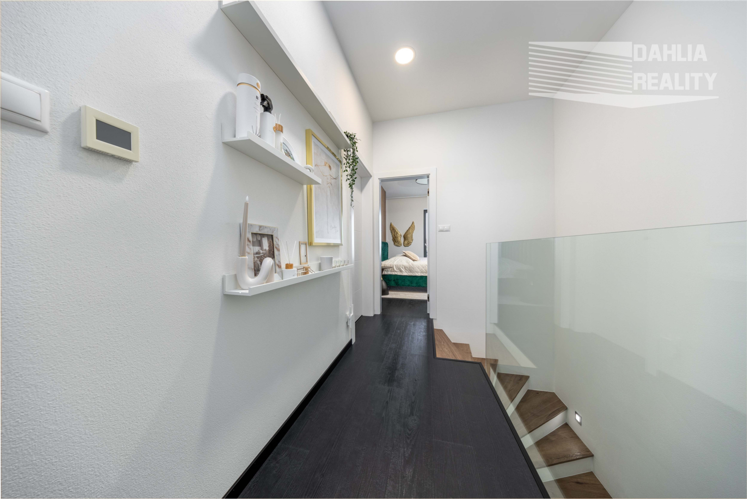 Cez moderné drevené schodište s moderným skleneným zábradlím sa dostaneme na 2. podlažie domu, kde sa nachádza: