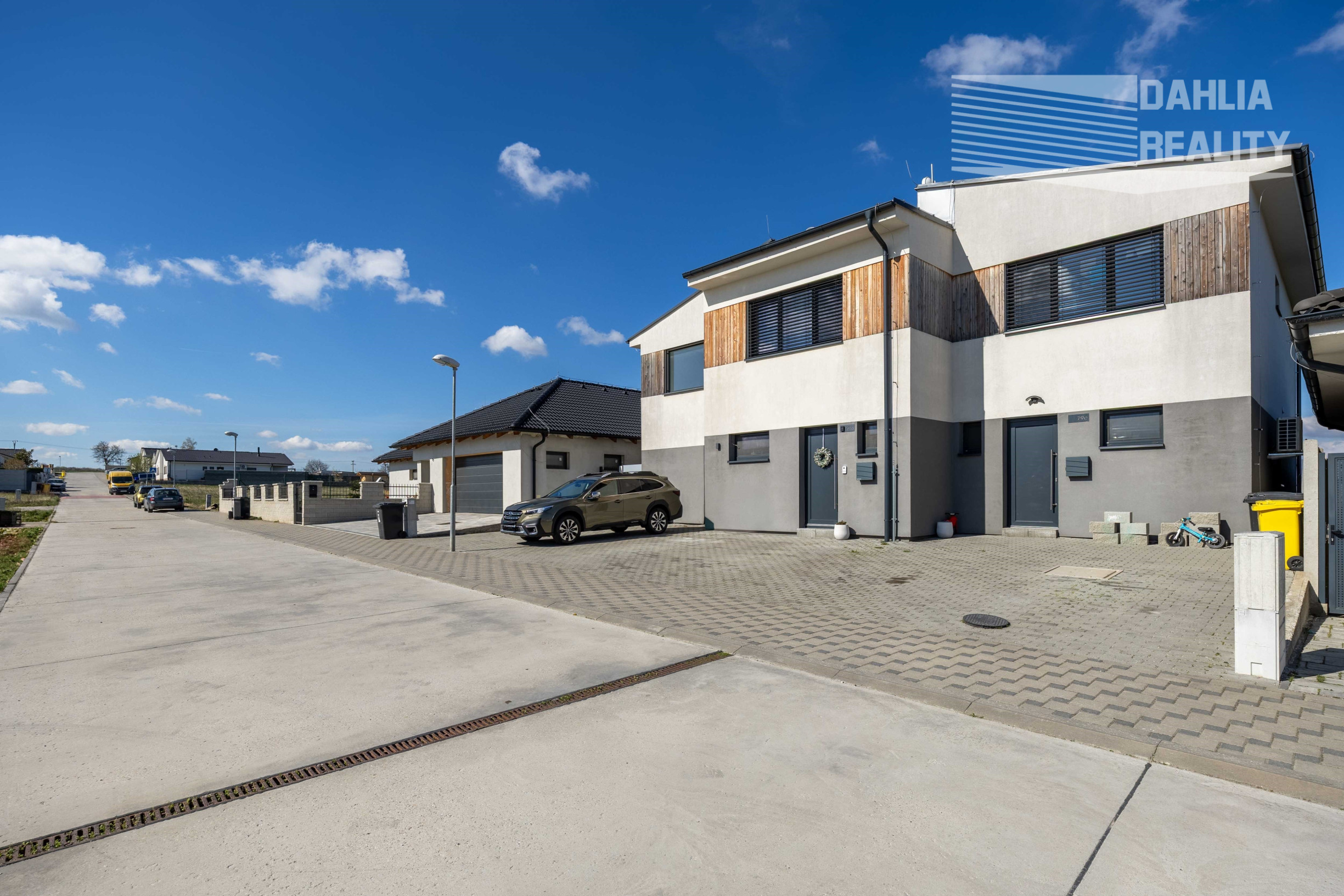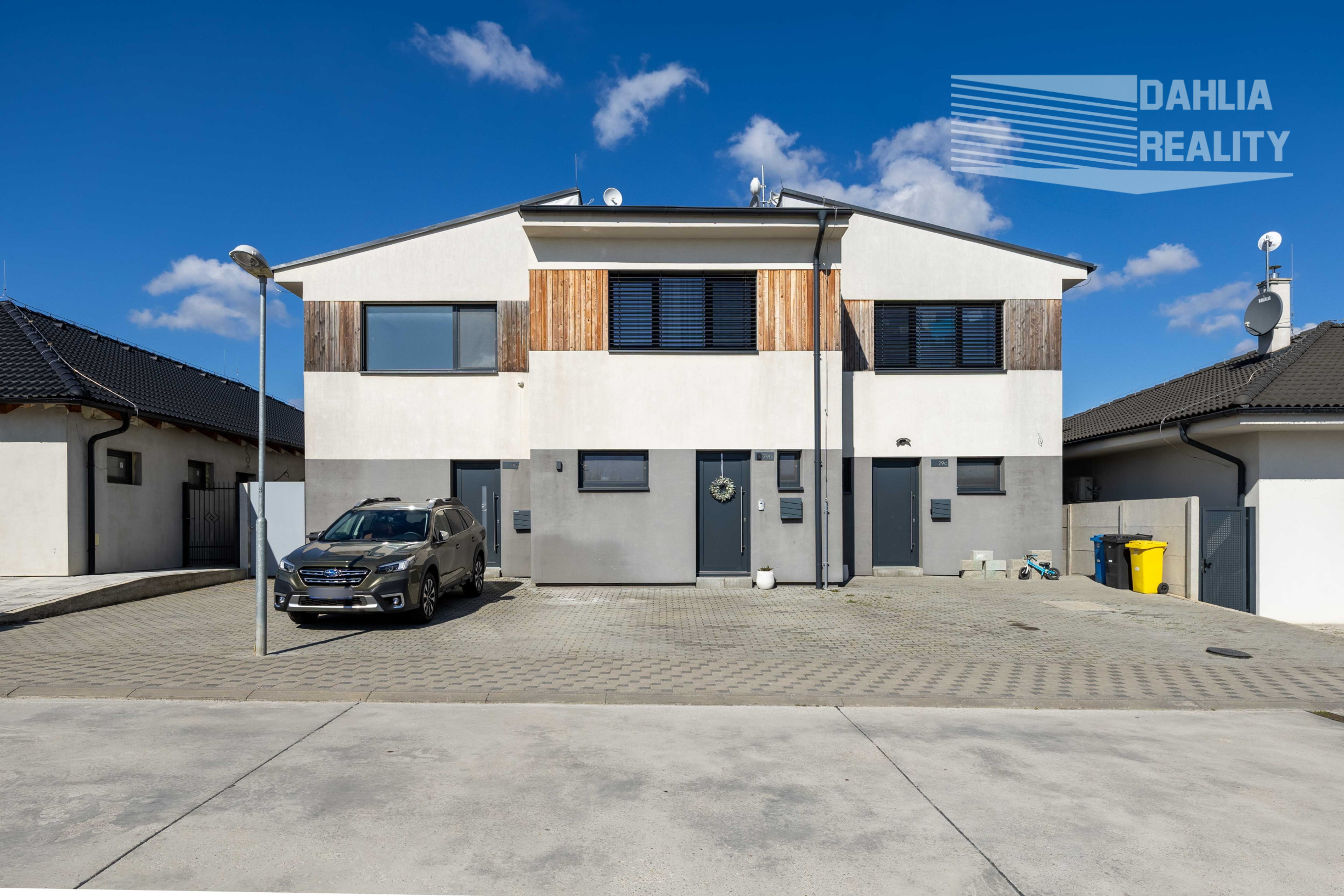 Dom je postavený z tehál s rovnou strechou /stredná časť trojdomu/, zateplená stavba podľa nových štandardov, kolaudovaná v roku 2020. Celková úžitková plocha domu je 130 m2, z čoho 10 m2 tvorí horný balkón s úžasným výhľadom na Malé Karpaty a 20 m2 prekrytá terasa, z ktorej vďaka miernemu svahovitému terénu je taktiež krásny výhľad na Karpaty a okolie. Celková výmera samostatnej záhrady je 150 m2. Priamo pred domom sú vyčlenené a vybudované dve vonkajšie parkovacie miesta.
